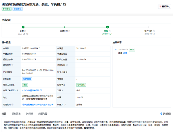 【CNMO科技消息】近日,相关平台信息显示,小米汽车科技有限公司申请的“线控转向系统的力反馈方法、装置、车辆和介质”专利正式获得授权,授权公告号为CN116605287B,申请日期为2023年6月。